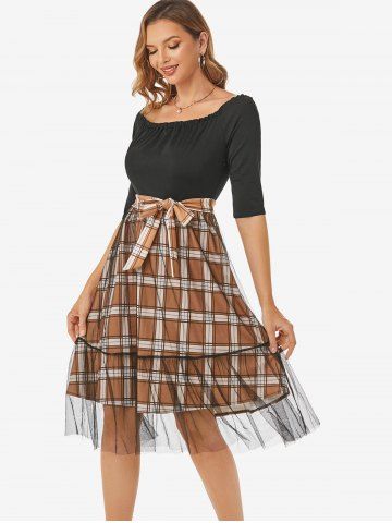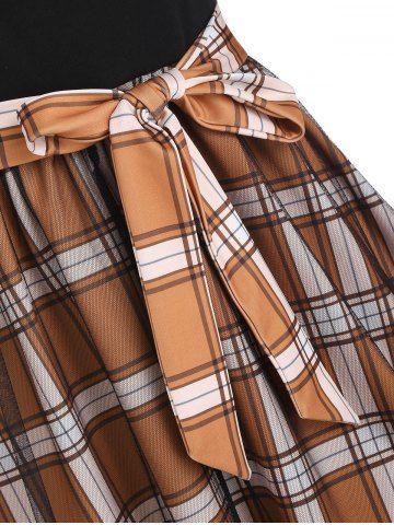 Belted Plaid Lace Overlay Dress - Coffee - L