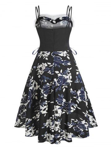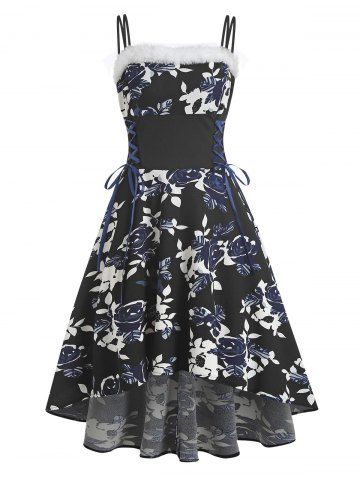 Lace Up Floral Print Faux Fur Insert High Low Dress - Black - M