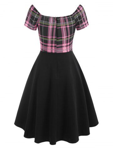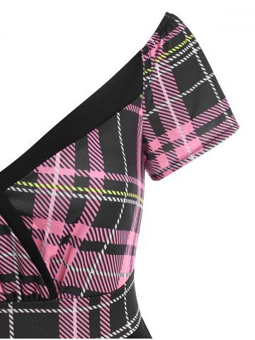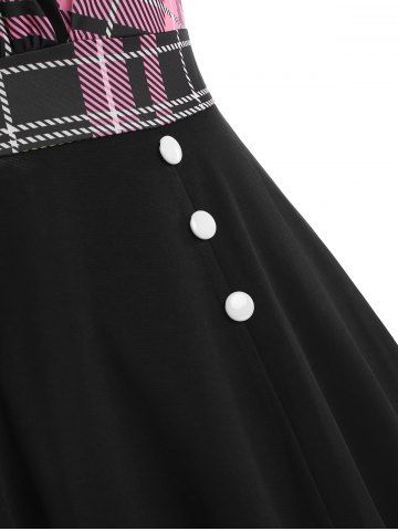 Plunging Plaid Flower Print Mock Button Dress - Light Pink - 2xl