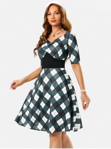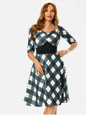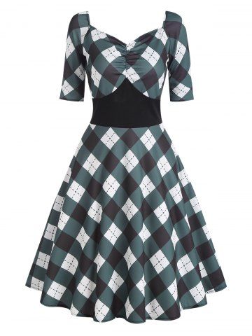Ruched Plaid Empire Waist Dress - Deep Green - M