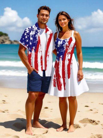 4th Of July Outfits > Painting Patriotic American Flag Print Plus Size Matching Outfit For Couples