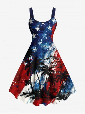Patriotic American Flag Coconut Tree Paint Splatter Print Plus Size Matching Hawaii Beach Outfit For Couples - Blue