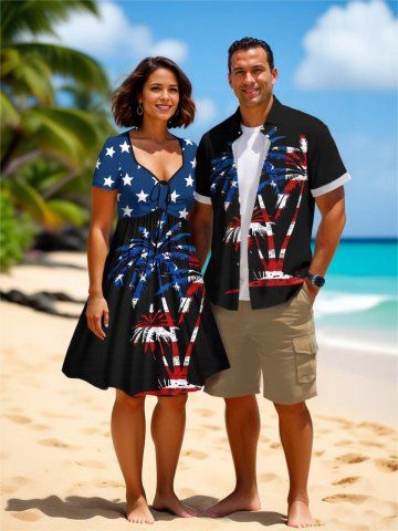 4th Of July Outfits > Patriotic American Flag Coconut Tree Print Plus Size Matching Outfit For Couples