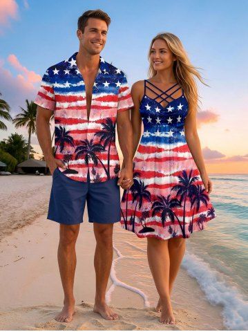4th Of July Outfits > Patriotic American Flag Coconut Tree Tie Dye Print Plus Size Matching Outfit For Couples