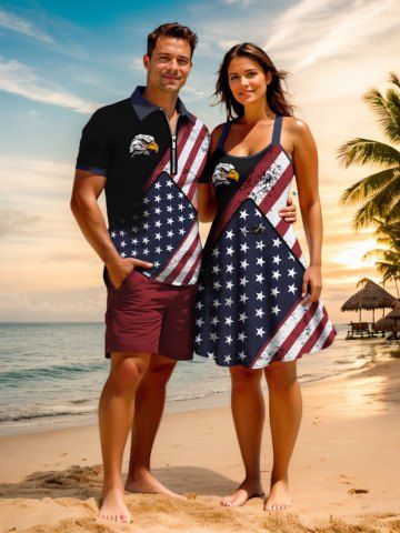 4th Of July Outfits > Patriotic American Flag Eagle Print Plus Size Matching Outfit For Couples