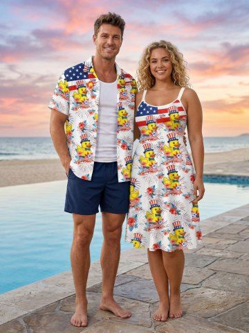 4th Of July Outfits > Patriotic American Flag Fireworks Ducks Flower Print Plus Size Matching Outfit For Couples