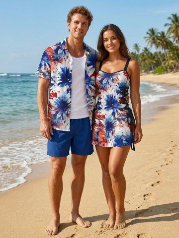 4th Of July Outfits > Patriotic American Flag Flowers Paint Splatter Print Matching Outfit For Couples