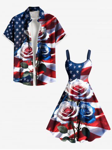 4th Of July Outfits > Patriotic American Flag Rose Flower Print Plus Size Matching Hawaii Beach Outfit For Couples