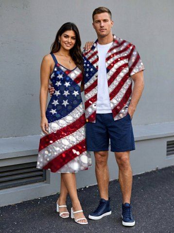 4th Of July Outfits > Patriotic American Flag Sparkling Sequin 3D Print Plus Size Matching Outfit For Couples