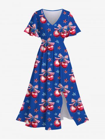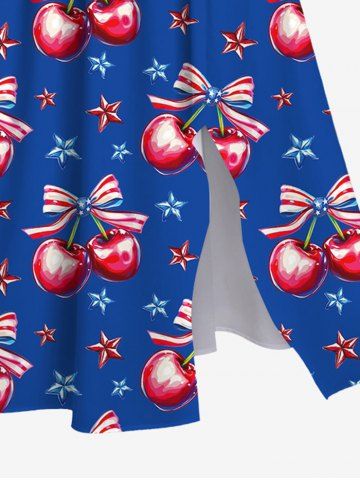 C*****r5Plus Size Patriotic American Flag Star Bowknot Cherry Fruit Print Split DressColor: SKY BLUE Size: 4XSuch a fun dress. Soft and silky feel. What a fun pattern.