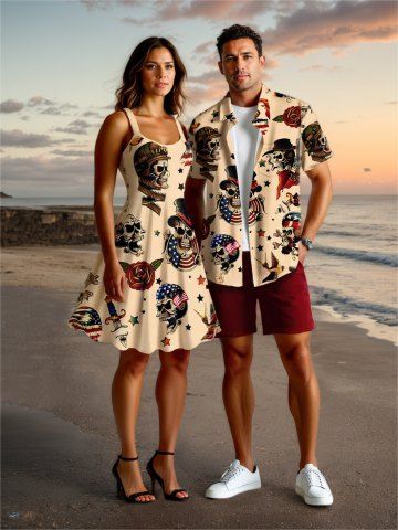 4th Of July Outfits > Skull Pirate Patriotic American Flag Rose Flower Print Plus Size Matching Hawaii Beach Outfit For Couples