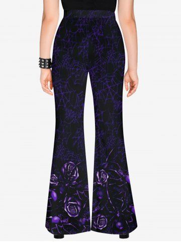 Gothic Christmas 3D Glitter Rose Flower Spider Web Print Pull On Flare Pants - Black - L
