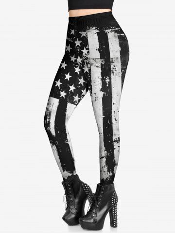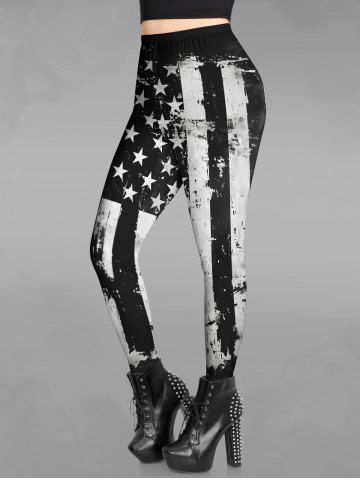Gothic Ink Painting Striped Star Patriotic American Flag Print Skinny Leggings - Black - 4x
