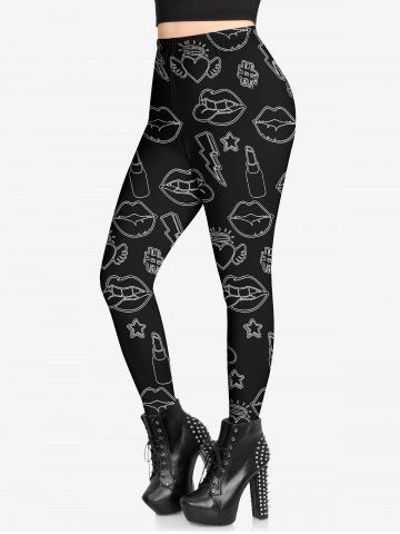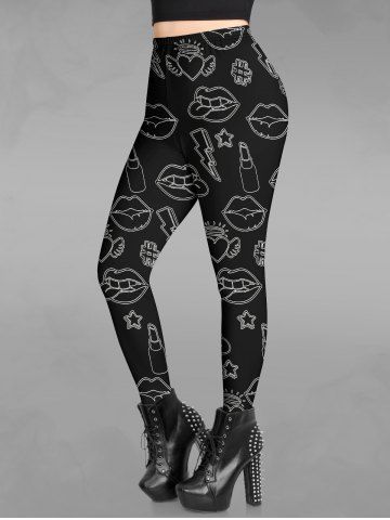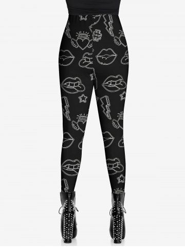 Gothic Lip Star Heart Lipstick Lightning Print Valentines Skinny Leggings - Black - 2x