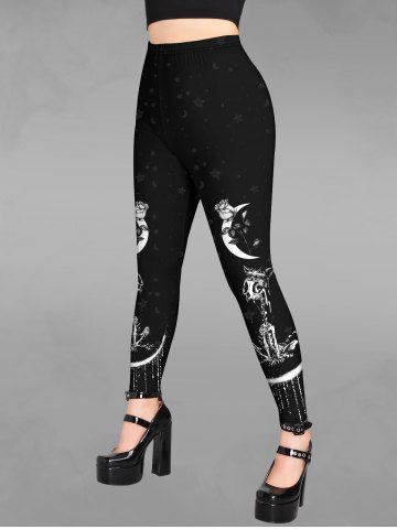 Gothic Moon Star Rose Flower Skull Print Halloween Skinny Leggings - Black - S