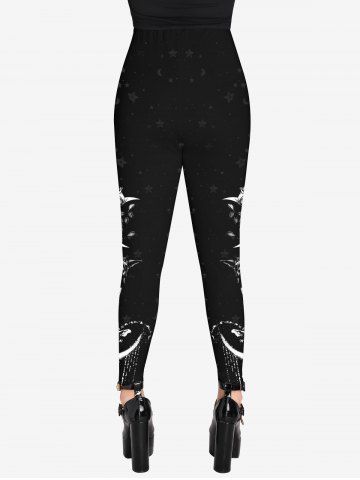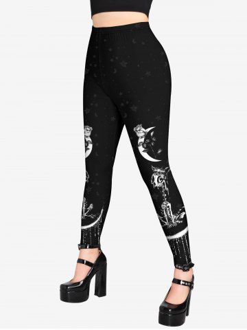 Gothic Moon Star Rose Flower Skull Print Halloween Skinny Leggings - Black - 5x