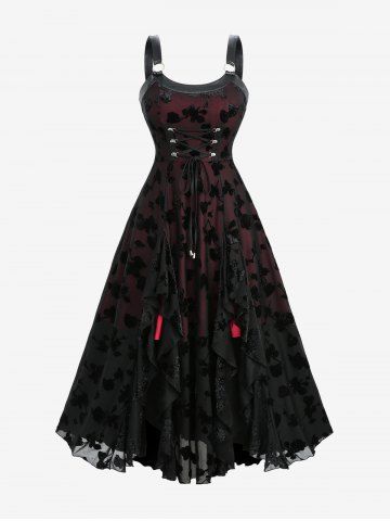 Gothic Floral Silver Flocking Lace Up Panel Lettuce Ruffles Hem Tank Dress - Black - S