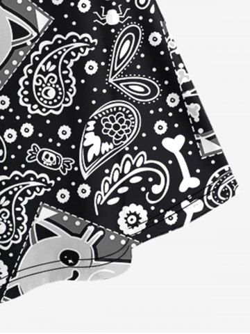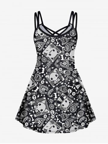 Gothic Cartoon Cute Cat Floral Bone Paisley Graphic Print Crisscross Cami Dress - Black - Xs