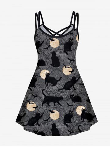 Gothic Cat Moon Bat Print Crisscross Cami Dress - Black - 1x