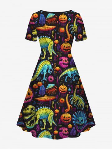 Gothic Colorful Skull Pumpkin Dinosaur Sailor Print Halloween Cinched Dress - Multi-a - M