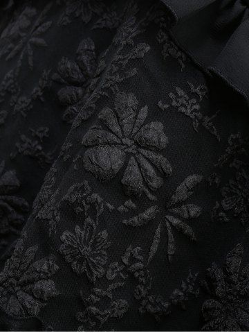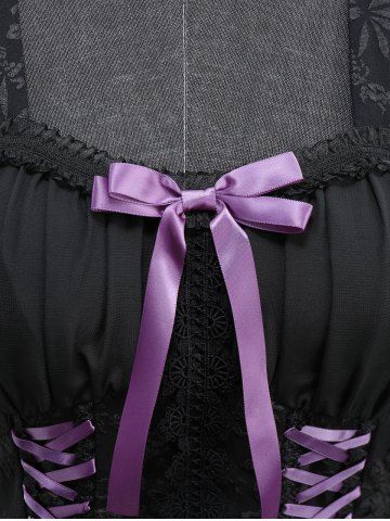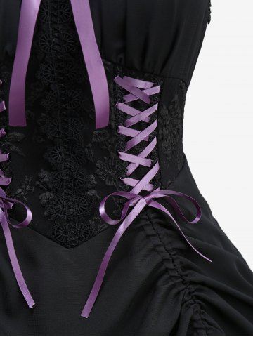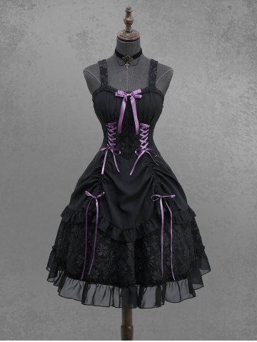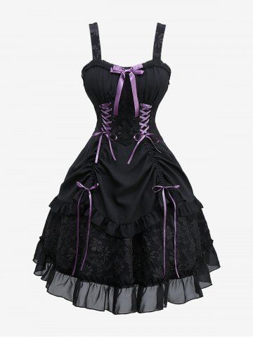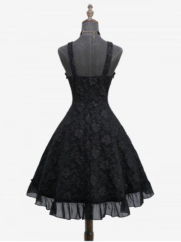 Gothic Daisy Flower Jacquard Bowknot Cinched Lace Up Ruffles Chiffon Trim Patchwork A Line Tank Dress - Black - L