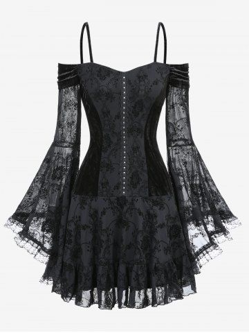 Gothic Flare Sleeve Cold Shoulder Floral Lace Mesh Flocking Velvet Patchwork Ruched A Line Cami Dress - Black - L