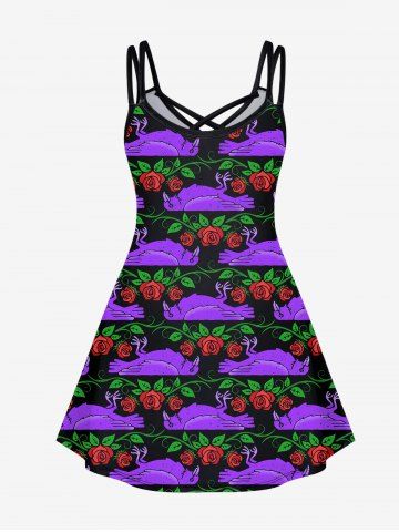 Gothic Floral Eagle Leaf Print Crisscross Cami Dress - Purple - 1x
