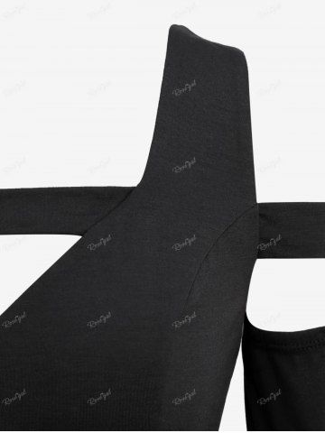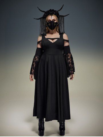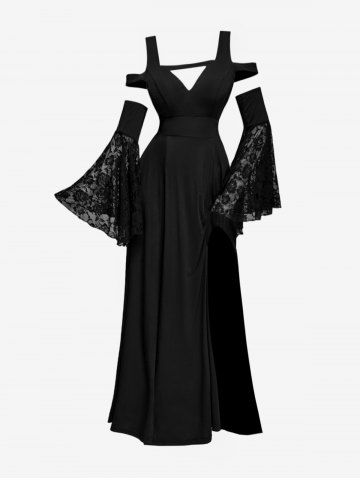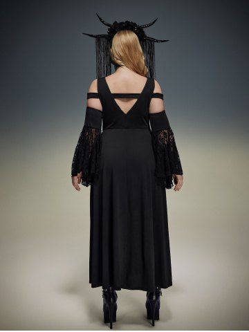 Gothic Flower Rose Lace Bell Sleeves Cold Shoulder Stripe Panel Ruched A Line Dress - Black - 1x | Us 14-16
