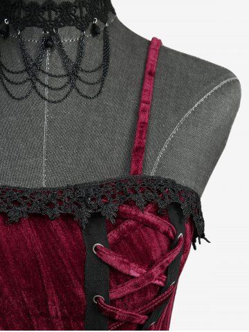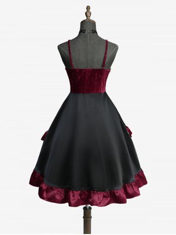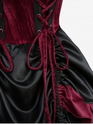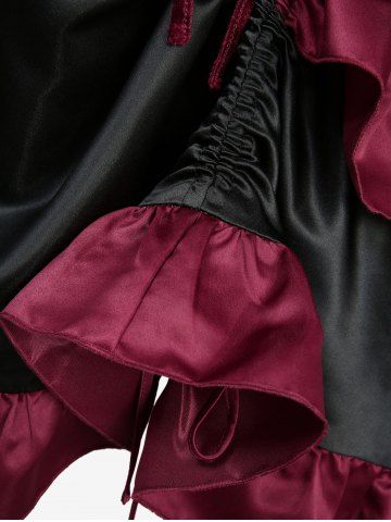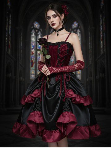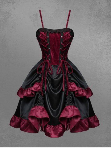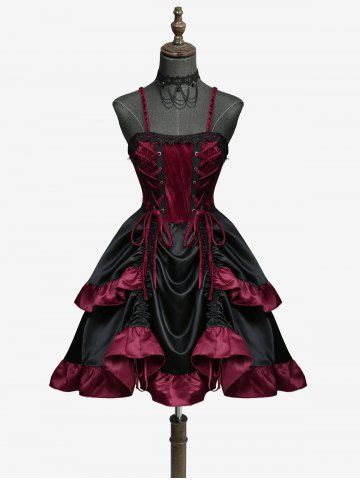 Gothic Lace Up Cinched Ruffles Layered A Line Dress - Deep Red - S