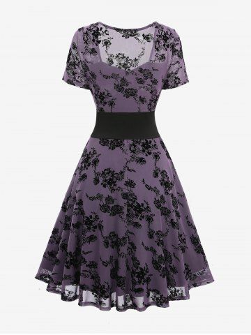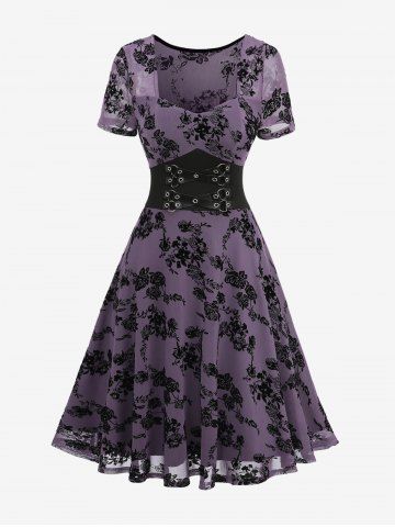 Gothic Rose Floral Mesh Flocking D-Ring PU Lace Up Grommet A Line Dress - Purple - L