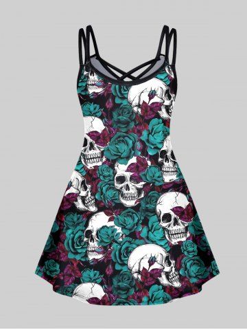 Gothic Skull Rose Print Crisscross Detail Sleeveless Sundress