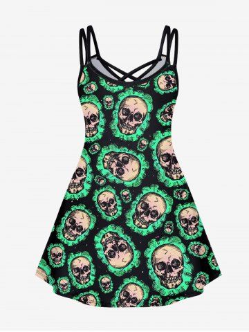 Gothic Skull Print Crisscross Cami Dress - Green - Xs