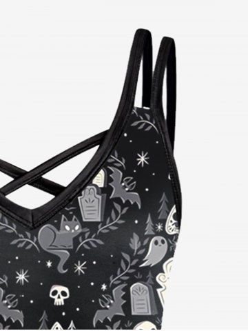 Gothic Skulls Cat Bat Tombstone Ghost Print Crisscross Cami Dress - Black - 4x