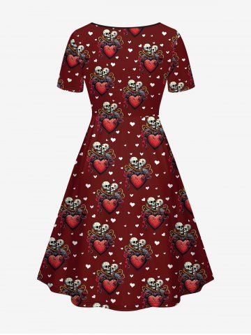 Gothic Skulls Skeleton Heart Lovers Print Cinched A Line Valentines Dress - Red - M