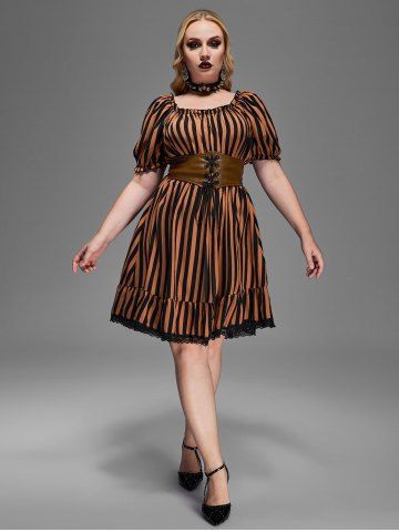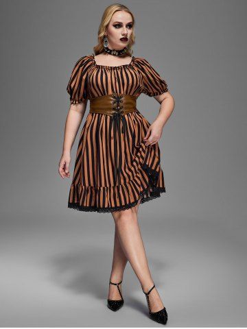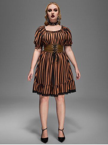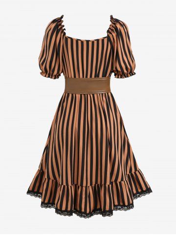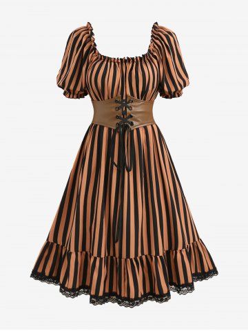Gothic Striped Printed Puff Sleeves Ruched Lace Trim Lace-up PU Panel Belted A Line Dress - Coffee - 1x | Us 14-16