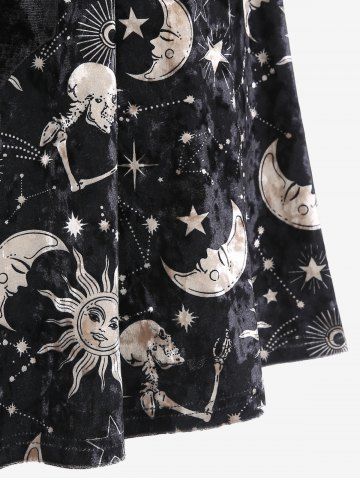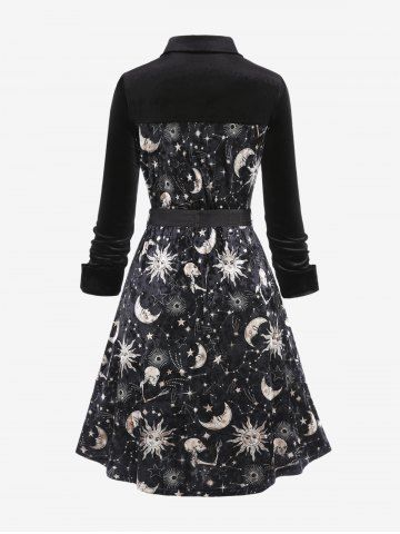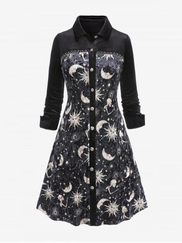 Gothic Sun Moon Star Printed Full Buttons Turn-down Collar Tied A Line Shirted Velvet Dress - Black - L | Us 12