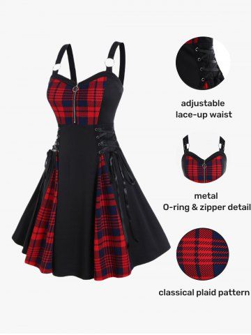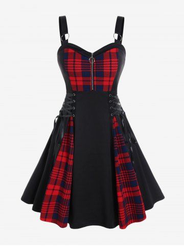 Alternative & Gothic Dress > Gothic Plus Size Plaid Colorblock Print Lace Up Half Zipper Patchwork Fit and Flare Dress