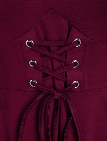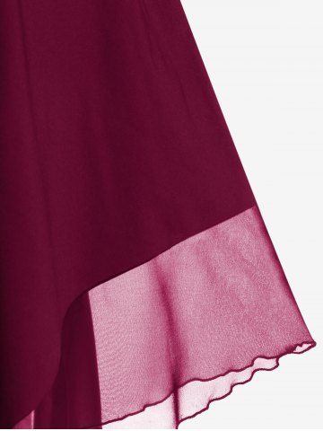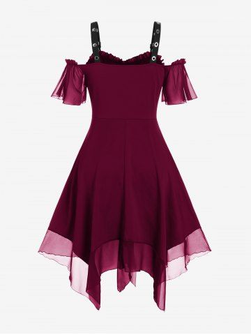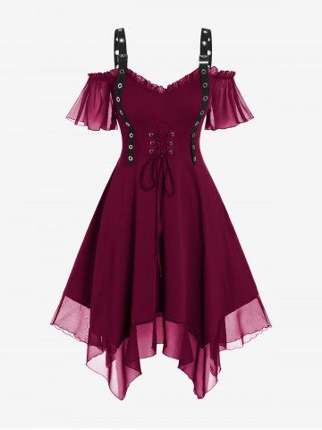 Gothic Plus Size Cold Shoulder Lace Up Grommet Handkerchief Chiffon Asymmetric Dress - Deep Red - 1x | Us 14-16