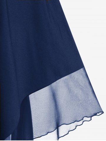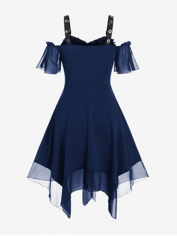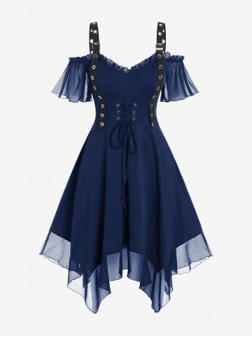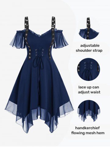 Gothic Plus Size Cold Shoulder Lace Up Grommet Handkerchief Chiffon Asymmetric Dress - Deep Blue - 1x | Us 14-16