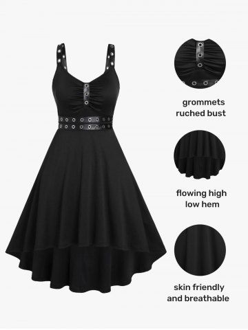 B*****b5Plus Size Punk Eyelets Ruched High Low Gothic Midi DressColor: BLACK Size: 4XThis is a beautiful black dress with a grommet attatched double belt, front and shoulder straps. The material is soft and comfortable, perfect fit, shipped fast and packaged nicely. High quality design and made very well!