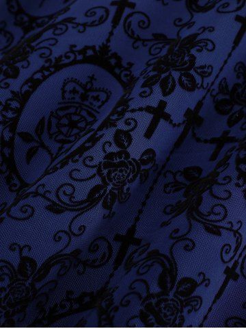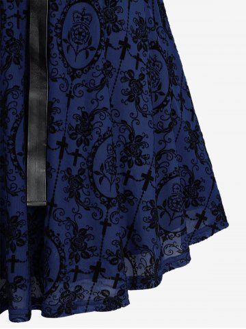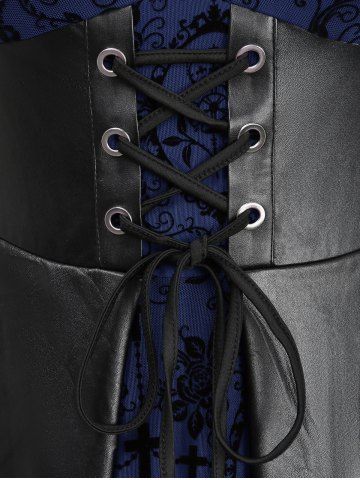 Gothic Plus Size Lace Trim Grommets Lace-up PU Leather Patchwork Floral Flocking 2 In 1 Tank Dress - Deep Blue - 1x | Us 14-16