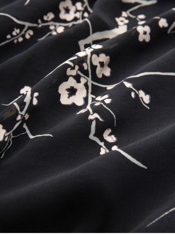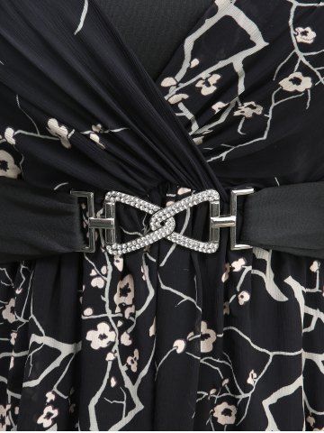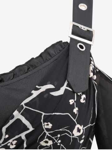 Gothic Plus Size Plum Bossom Flower Print Surplice Ruffles Asymmetrical Grommets Buckle Cold Shoulder Dress - Black - 2x | Us 18-20