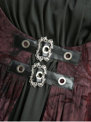 Gothic Plus Size Tie Dye Print Floral Flocking Ruched Buckles Panel Cold Shoulder Tank Dress - Deep Red - 2x | Us 18-20