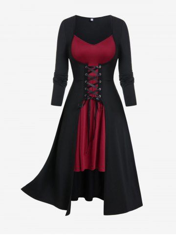 Alternative & Gothic Dress > Gothic Two Tone Lace-up Asymmetrical Midi Dress