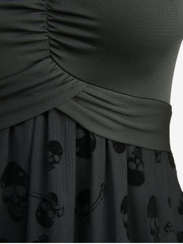 Gothic Ruched Skulls Flocking Mesh Asymmetrical Cold Shoulder Dress - Black - M