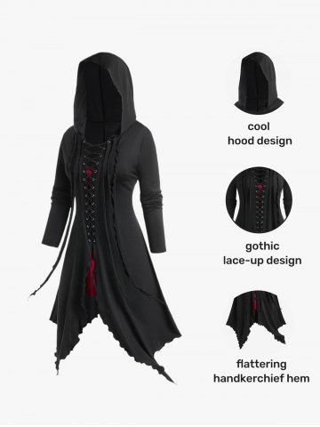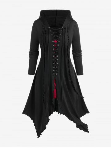 Gothic Lace-up Hooded Two Tone Trim Handkerchief Longline Coat - Black - 2x | Us 18-20