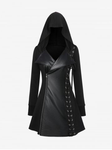 L*****e4Gothic PU Panel Turn-down Collar Grommet Lace Up Braided Side Zip Hooded CoatColor: BLACK Size: 1X | US 14-16coat is very good quality and all around just fantastic ....very warm and comfortable as well