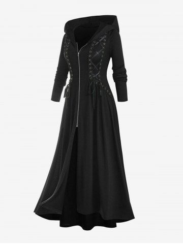 Gothic Plus Size Hooded Lace Up Front Zipper High Low Maxi Coat - Black - 2x | Us 18-20