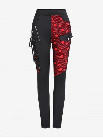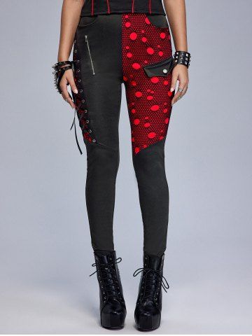 Gothic Colorblock Mesh Overlay Lace-up Zippered Skinny Pants - Red - M | Us 10