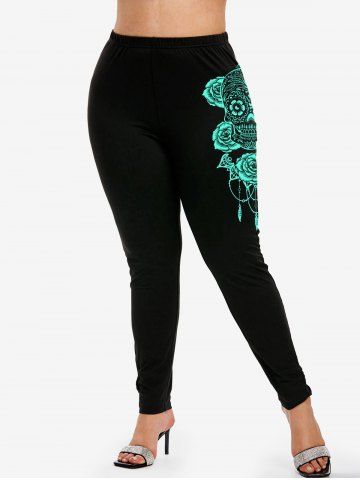 Gothic High Waist Rose Skull Print Skinny Leggings - Black - 3x | Us 22-24